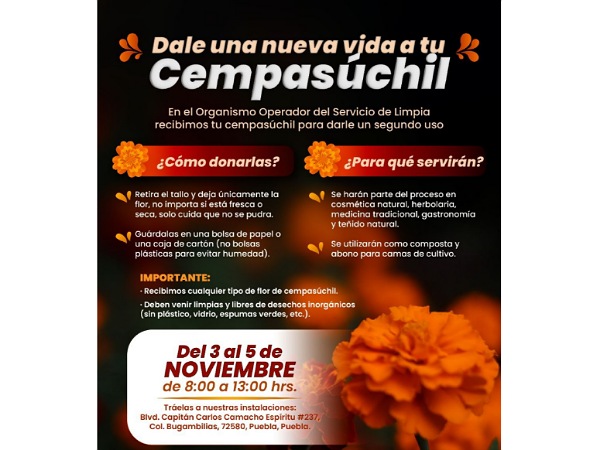 Como parte de esta iniciativa, se habilitó un Centro de Acopio Temporal para recolectar flores de cempasúchil que permanecerá hasta el 5 de noviembre, en un horario de 8:00 a 13:00 horas, en Blvd. Capitán Carlos Camacho Espíritu No. 237, Colonia Bugambilias, para dar una segunda vida a las flores que tradicionalmente son desechadas tras las festividades.