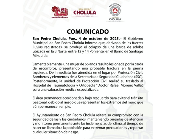 4 de octubre de 2025. San Pedro Cholula, Pue. – El Gobierno Municipal de San Pedro Cholula informa que, derivado de las fuertes lluvias registradas, se produjo el colapso de una barda de adobe ubicada en la 3 Norte, entre 12 y 14 Poniente, en el Barrio de Santiago Mixquitla.