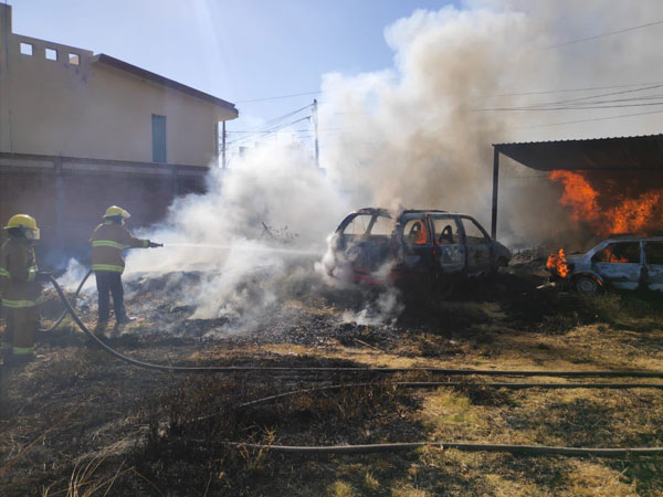 San Pedro Cholula, Pue.- Elementos de la Secretaría de Protección Civil de San Pedro Cholula, combatieron y sofocaron un incendio registrado dentro de un predio particular, en la Junta Auxiliar de San Sebastián Tepalcatepec, donde dos vehículos y un remolque resultaron calcinados.