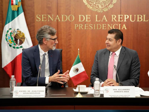 El presidente de la Mesa Directiva del Senado de la República, Alejandro Armenta Mier, recibió la visita del embajador de Francia en México, Jean-Pierre Asvazadourian, reunión en la que coincidieron en fortalecer las relaciones de ambas naciones y favorecer el bienestar de las y los ciudadanos.