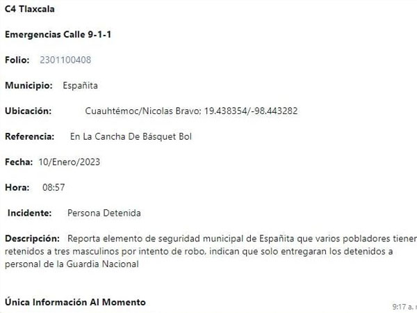 Aproximadamente tres horas después se recibió un segundo reporte al 911, para solicitar el apoyo de la Secretaría de Seguridad Ciudadana (SSC) y rescatar a tres personas retenidas y señaladas por el presunto delito de robo; ante estos hechos, se activó el protocolo correspondiente y elementos policiacos estatales llegaron a la zona referida, en un tiempo de respuesta de 13 minutos donde constataron que las personas eran agredidas.