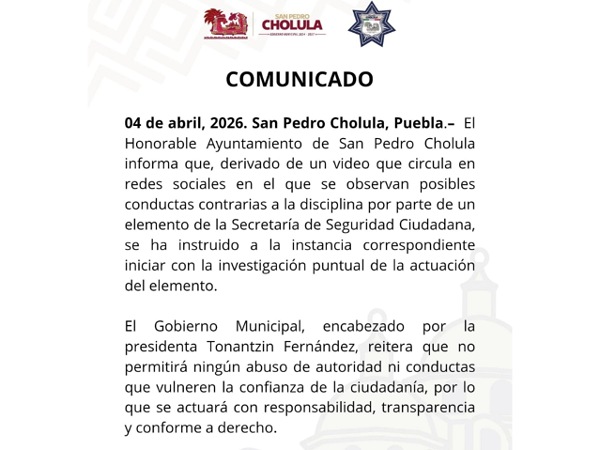 4 de abril, 2026. San Pedro Cholula, Pue.- El Honorable Ayuntamiento de San Pedro Cholula informa que, derivado de un video que circula en redes sociales en el que se observan posibles conductas contrarias a la disciplina por parte de un elemento de la Secretaría de Seguridad Ciudadana, se ha instruido a la instancia correspondiente iniciar con la investigación puntual de la actuación del elemento.