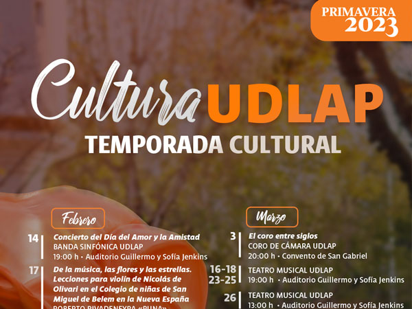 Todos estos eventos son parte de la oferta cultural UDLAP Primavera 2023, están sujetos a cambios y son de libre acceso. Para estar al tanto de estas actividades visite la cartelera cultural de la UDLAP disponible a través de las redes sociales oficiales, así como del sitio web: https://www.udlap.mx/eventos/