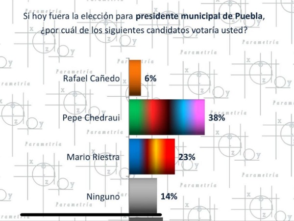 Es decir, que en la pregunta “Si hoy fuera la elección para presidente municipal de Puebla ¿Por cuál de los siguientes candidatos votaría usted?, Pepe Chedraui tuvo una respuesta favorable del 38 por ciento, lo que representa un aumento de tres puntos en comparación con marzo.