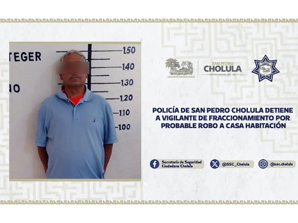 de Seguridad Ciudadana de San Pedro Cholula (SSC Cholula) detuvieron a Julián “N”, de 56 años de edad, por su probable participación en el delito de robo a casa habitación, ocurrido en un inmueble ubicado sobre la carretera estatal a Coronango, al interior del Fraccionamiento San Joaquín, conocido como San Diego Los Sauces.