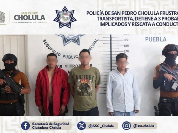28 de marzo, 2025. San Pedro Cholula, Pue.- Como resultado de una oportuna intervención, elementos de la Secretaría de Seguridad Ciudadana de San Pedro Cholula (SSC Cholula) detuvieron a Juan Carlos “N” de 29 años de edad; Jesús Abad “N” de 38 años y Josafat “N” de 46 años, por su probable participación en robo de vehículo con mercancía y privación de la libertad.