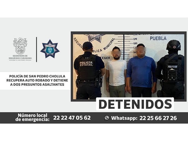Tras una intensa persecución que concluyó en la ciudad de Puebla, elementos de la Secretaría de Seguridad Ciudadana de San Pedro Cholula (SSC Cholula), en coordinación con la Secretaría de Seguridad Pública del Estado, lograron el aseguramiento de Martín “N” y Enrique “N”, ambos de 30 años de edad, por su presunta participación en el delito de detentación de vehículo con reporte de robo.