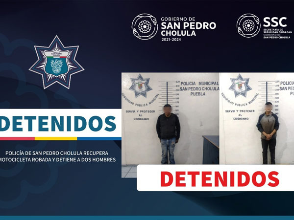 San Pedro Cholula, Pue.- Como resultado de las estrategias de seguridad y de respuesta inmediata, elementos de la Secretaría de Seguridad Ciudadana de San Pedro Cholula (SSC Cholula), detuvieron a Rosendo “N”, de 35 años de edad, y José Manuel “N”, de 18 años, por su presunta participación en el robo de una motocicleta sustraída de un negocio en San Matías Cocoyotla.