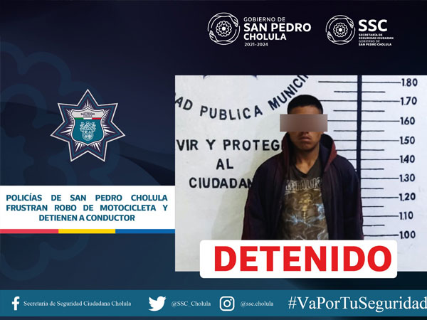San Pedro Cholula, Puebla.- Como resultado de estrategias de vigilancia, elementos de la Secretaría de Seguridad Ciudadana de San Pedro Cholula (SSC Cholula) detuvieron a Mario Jesús “N” de 23 años de edad, por el presunto delito de detentación de vehículo robado.