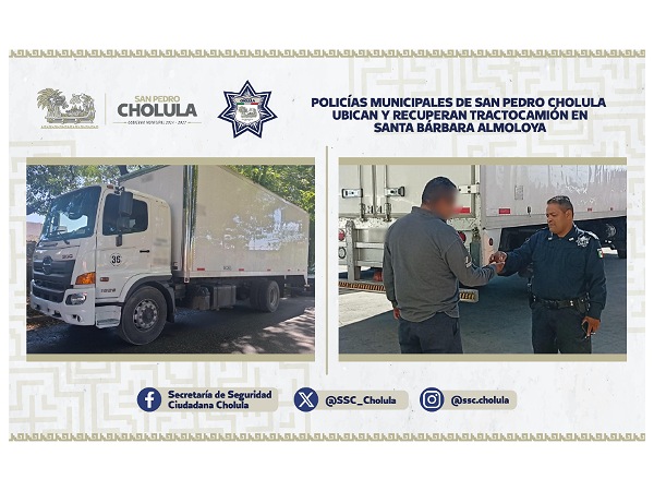 1 de abril, 2026. San Pedro Cholula, Pue. – Como parte de las acciones de seguridad implementadas por el Gobierno Municipal de San Pedro Cholula, elementos de la Secretaría de Seguridad Ciudadana (SSC Cholula) lograron ubicar y recuperar un tractocamión que había sido reportado como irregular en su ruta.