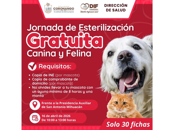 13 de abril de 2026.- Para promover el bienestar de nuestras mascotas, el DIF Municipal de Coronango, a través de la Dirección de Salud, organizará dos jornadas de esterilización gratuita para perros y gatos.