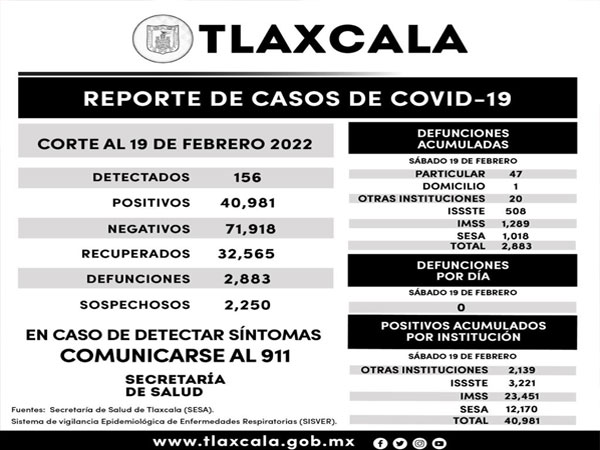 Santa Isabel Xiloxoxtla 123, Zitlaltepec 93, San Damián Texoloc 104, San José Teacalco 103, Atlangatepec 113, Santa Apolonia Teacalco 93, Sanctórum 73, Mazatecochco 75, Lázaro Cárdenas 76, Muñoz de Domingo Arenas 71, Santa Cruz Quilehtla 127, Españita 58, San Lucas Tecopilco 48, Benito Juárez 38 y Emiliano Zapata 30, datos acumulados en lo que va de la pandemia de 2020 al sábado 19 de febrero de 2022.