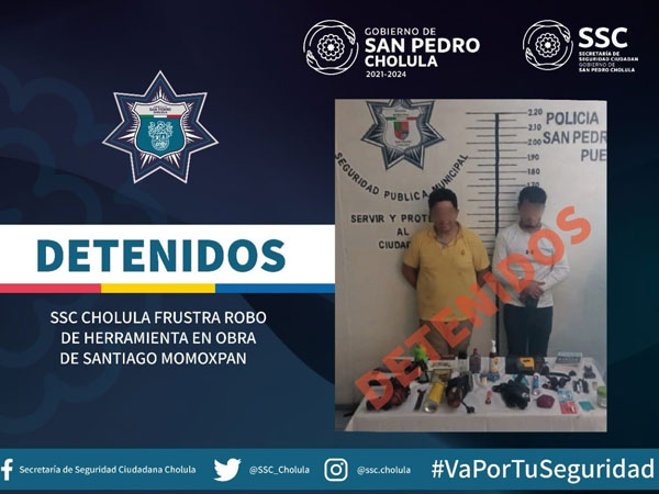 Como resultado de la respuesta inmediata a un llamado de emergencia, elementos de la Secretaría de Seguridad Ciudadana de San Pedro Cholula, detuvieron a Joseph “N” de 33 años de edad y Arnulfo “N” de 30 años, por presunto robo dentro de una obra en construcción.