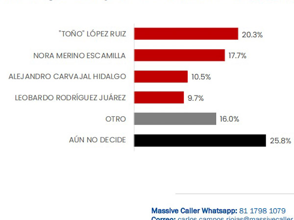 Por su parte, Toño López ocupa el primer lugar con el 20.3%, Nora Merino se ubica en el segundo puesto con 17.7%, mientras que Alejandro Carvajal y Leobardo Rodríguez en tercer y cuarto lugar, con 10.5 y 9.7%, respectivamente.