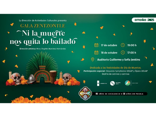 Cholula, Puebla; a 13 de octubre de 2025.- Con la participación de 19 bailarines en escena acompañados por la colaboración especial de la Orquesta Symphonia y de dos cantantes de Ópera UDLAP, Ni la muerte nos quita lo bailado, la gala de Zentzontle, Equipo Representativo de la Universidad de las Américas Puebla, promete ser un espectáculo lleno de color, música y tradición que rinde homenaje a una de las celebraciones más representativas de México: el Día de Muertos.